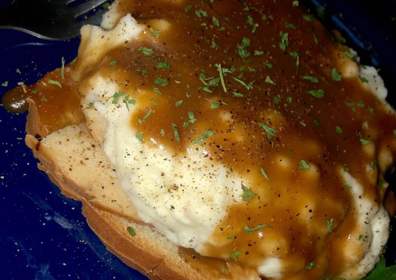- Scoop a nice size scoop of mashed potatoes on top the turkey and bread and top with gravy. Salt and pepper to taste. Garnish with dried parsley if you wish.