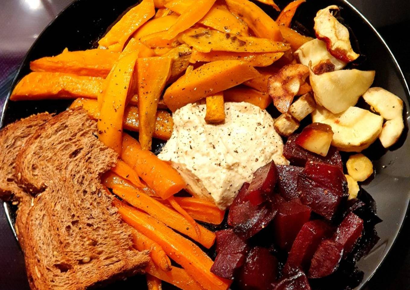 - After the vegetables are ready, serve them with hummus and the baked bread. Add pepper on top according to taste.