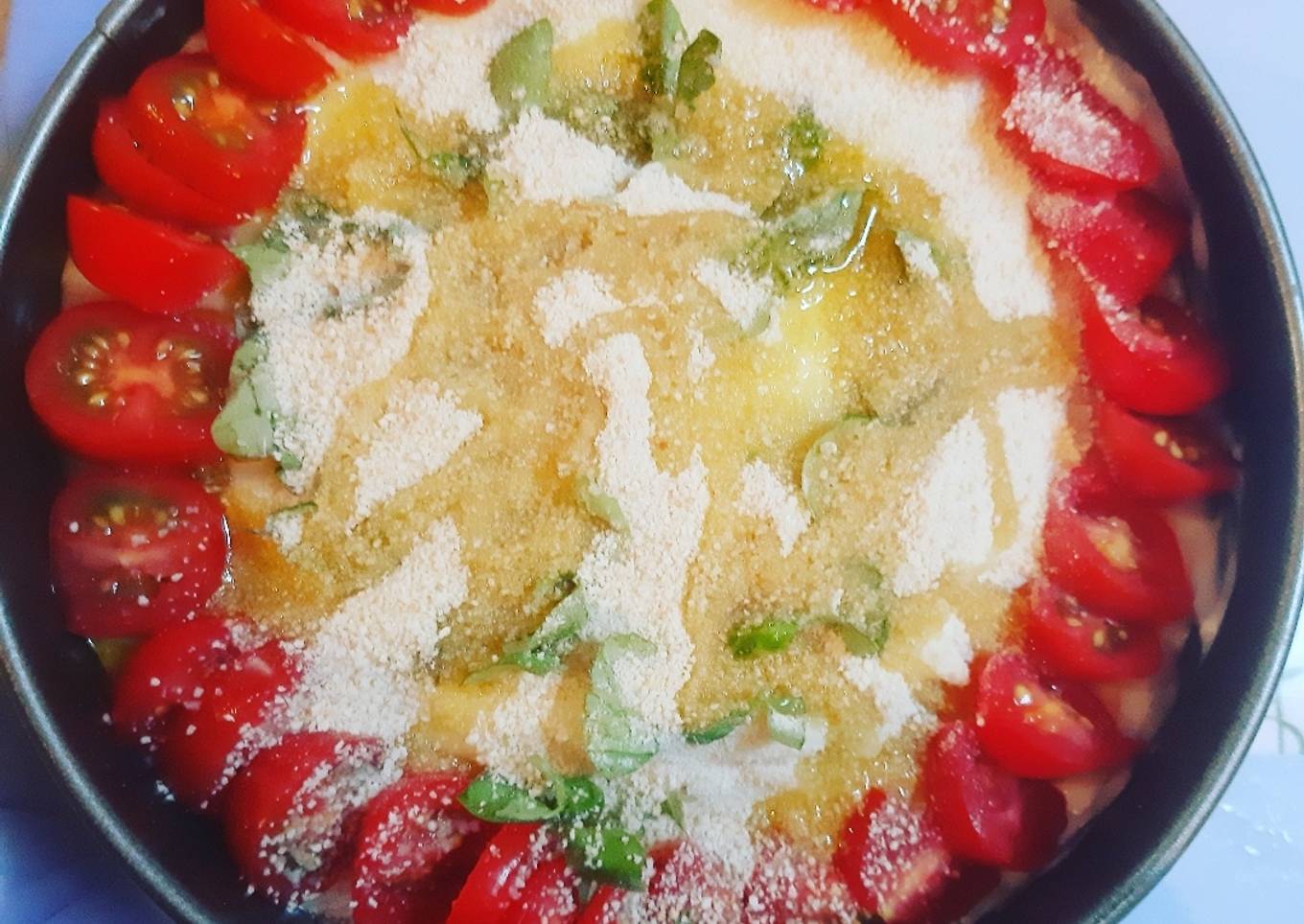 - Add fresh basil on top, then breadcrumbs, drizzle with olive oil