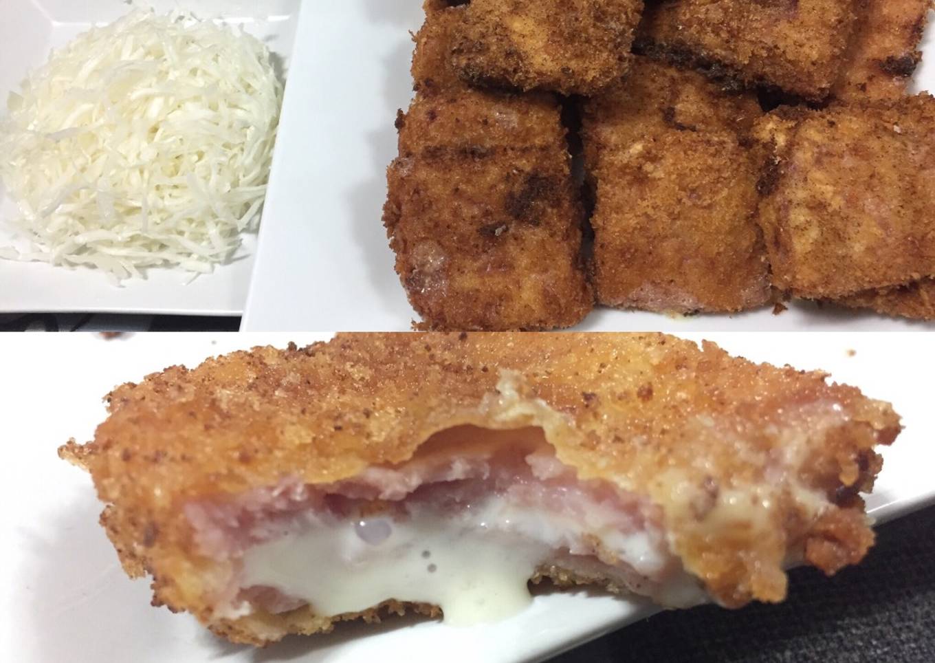 - Coat the Ham &Cheese with flour, then the beaten egg, then the bread crumbs.
