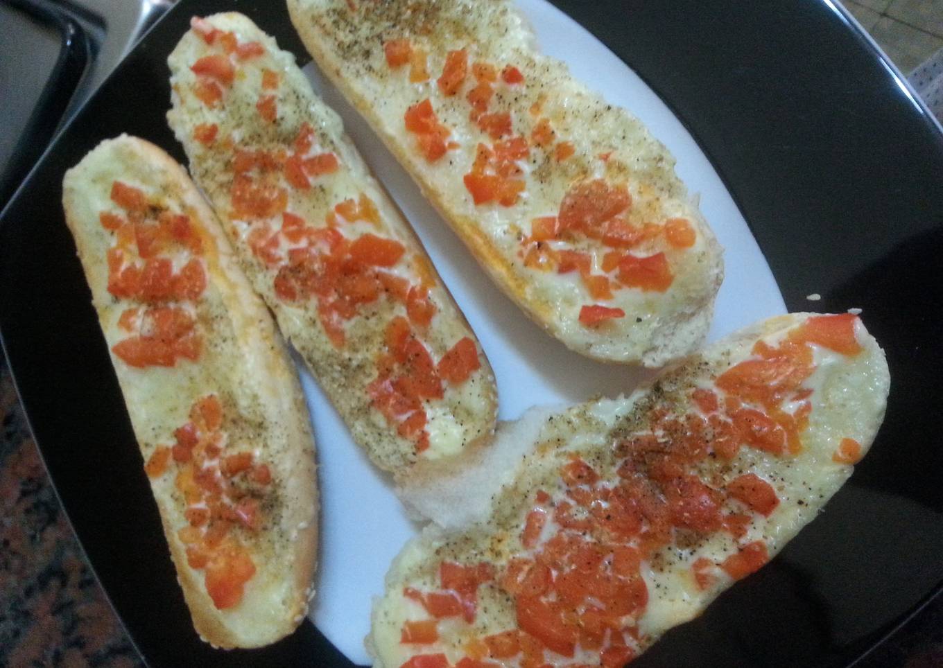 - Finely chop red bell pepper quarter, spread cream cheese or any cheese on bread and sprinkle the pepper and spices. Put under the griller for about 5 minutes till bread and cheese combine and brown at the sides. You may add butter on the bread before the cheese :)