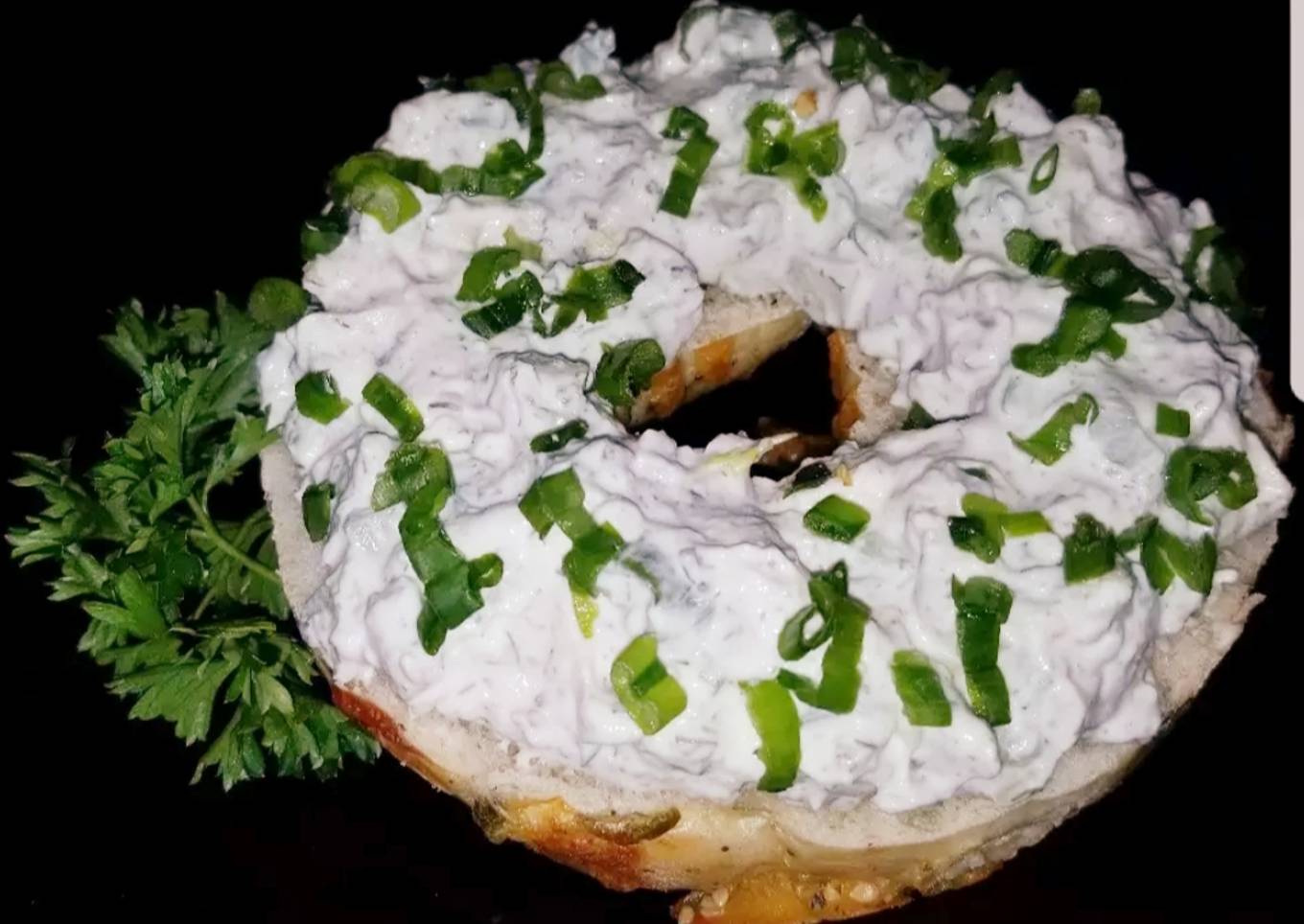 Homemade onion cream cheese spread on toasted onion bagels. Pure deliciousness!