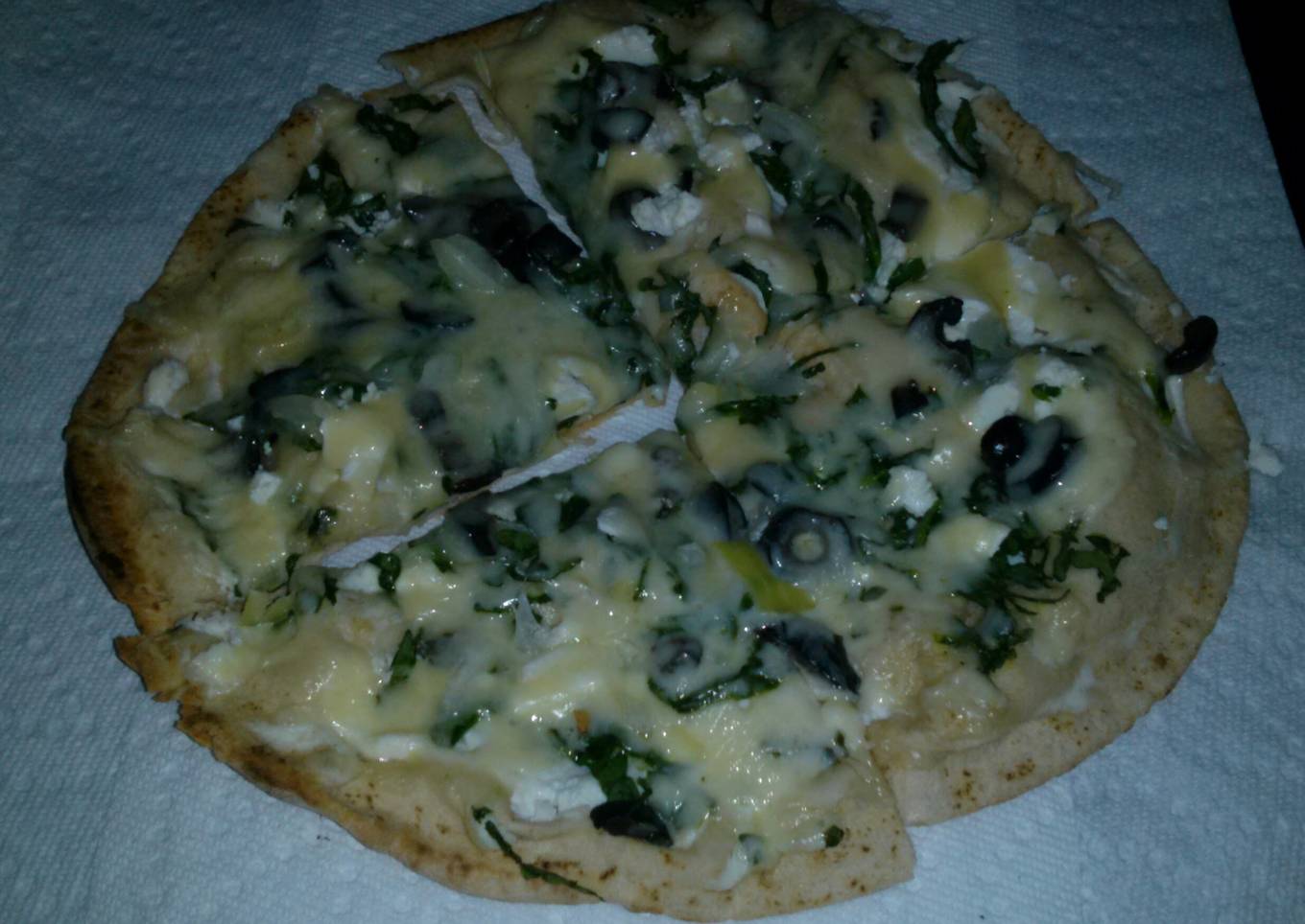 - Take a heaping tablespoon of ricotta and spread it all over the pita bread add the chopped spinach olives onions feta then add the mozarella on top sprinkle some garlic powder on top and bake for 8-10 minutes @ 375°f