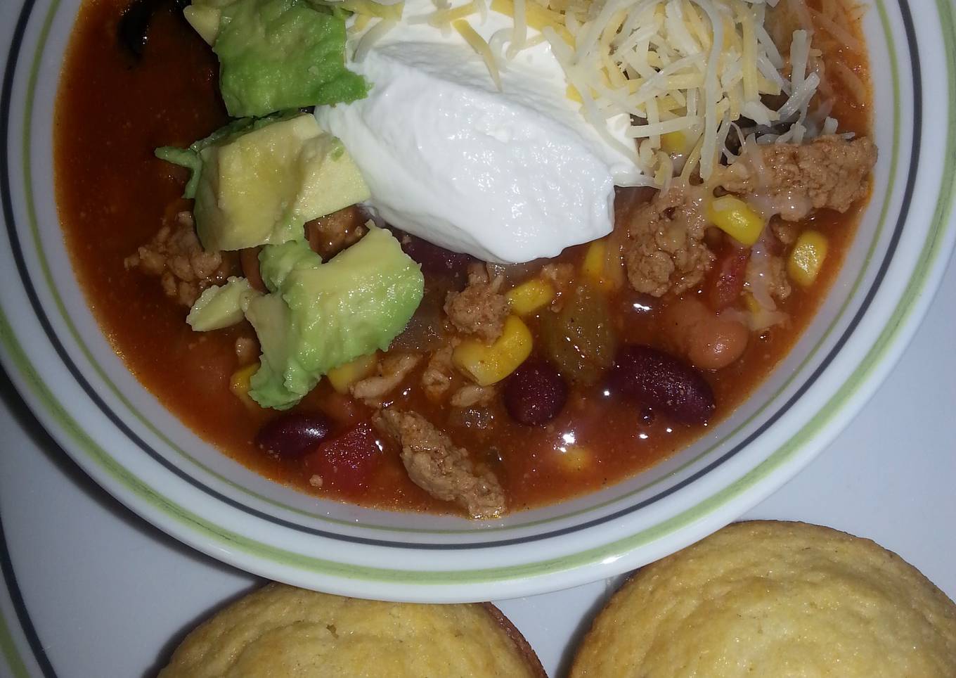 - Serve with corn bread and top with sour cream, avocado, cheese and hot sauce.